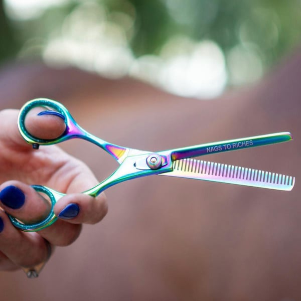 Thinning scissors with a standard blade on one side and thinning teeth on the other. Makes these scissors perfect for thinning manes